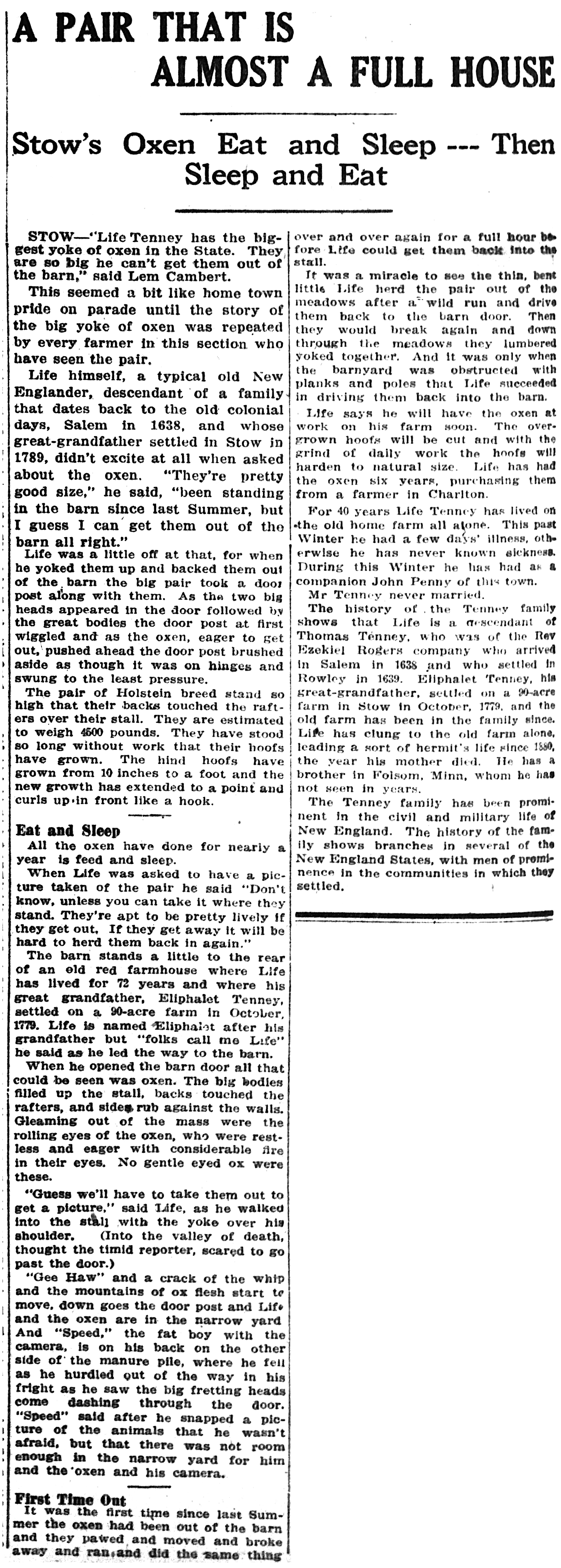 Life himself, a typical old New Englander, descendant of a family that dates back to the old colonial days, Salem in 1638, and whose great-grandfather settled in Stow in 1789, didn't excite at all when asked about the oxen. “They’re pretty good size,” he said, “been standing in the barn since last Summer, but I guess I can get them out of the barn all right.”